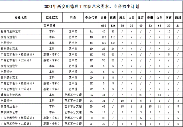 2021年学校招收播音与主持艺术(国际空乘方向、新闻主持方向、影视导演方向)、产品设计(工业产品设计方向、文化创意产品设计方向)、视觉传达设计(广告及平面设计方向、文化创意与策划方向)、数字媒体艺术(数字影像与数媒传播方向、数字媒体设计与交互方向)4个艺术类专业本科学生和广告艺术设计(插画设计方向、UI设计方向)1个艺术类专业高职(专科)学生。